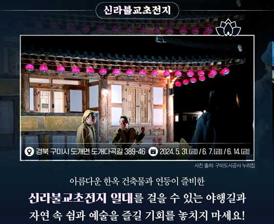 아름다운 한옥 건축물과 연등이 즐비한 신라 불교 초전지 일대를 걸을 수 있는 야행 길과 자연 속 쉼과 예술을 즐길 기회를 놓치지 마세요.