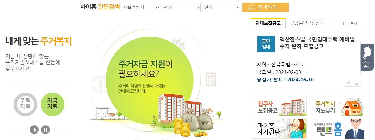 마이홈 홈페이지에서도 고령자 복지주택 공고를 확인할 수 있습니다. 공고를 확인한 후 해당 지역에 복지 주택 공급 일정이 있다면, 거주지 기관에 문의하시거나 LH 청약 센터에서 청약 신청을 하시면 됩니다.