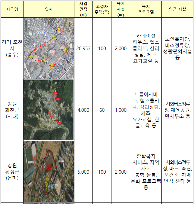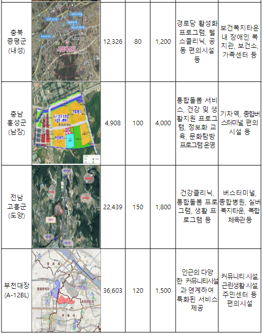 △ 경기 포천·부천(2곳), △ 강원 화천·횡성(2곳), △ 충북 증평, △ 충남 홍성, △ 전남 고흥에 임대주택과 사회복지시설이 결합된 고령자복지주택 710호 공급 추진