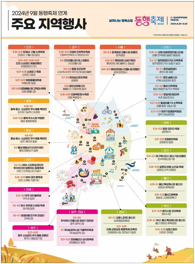 9월 중 문화·예술, 관광, 음식 등을 주제로 다채롭게 열리는 전국 46개 지역축제 및 행사와 연계하여 중소기업·소상공인 제품 판촉전을 엽니다.
