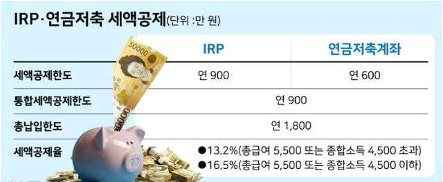 IRP에는 한 계좌당 연 1,800만 원까지 넣을 수 있고, 이 중 900만 원까지는 세금을 감면해 줍니다. 공제율은 총급여액이 5,500만 원 이하일 경우 16.5%, 5,500만 원 초과일 경우 13.2%입니다.