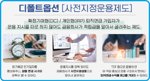 가입할 때 하나 더 알아둬야 할 게 있는데, 바로 '디폴트 옵션(사전지정운용제도)'을 꼭 지정해야 한다는 것입니다. 디폴트 옵션이란 고객이 별다른 투자 지시를 하지 않을 때, 금융회사가 어떻게 자동으로 굴려줄지 투자 방법을 지정하는 제도입니다.