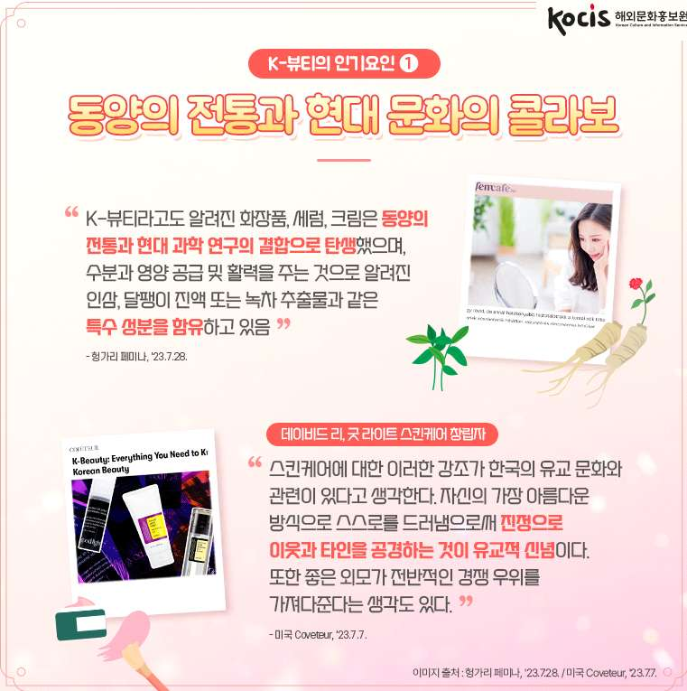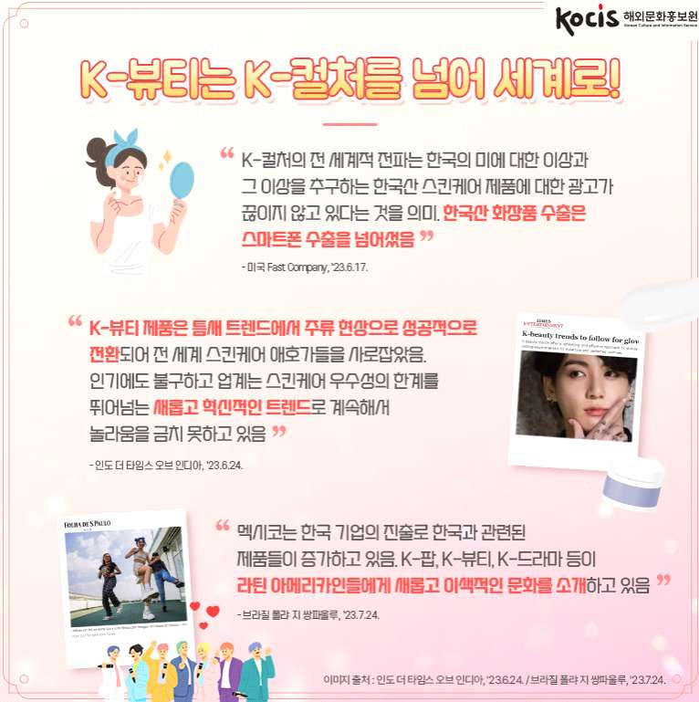 1. "K-컬처의 전 세계적 전파는 한국의 미에 대한 이상과 그 이상을 추구하는 한국산 스킨케어 제품에 대한 광고가 끊이지 않고 있다는 것을 의미. 한국산 화장품 수출은 스마트폰 수출을 넘어섰음"(미국 Fast Company, '23.6.17.)