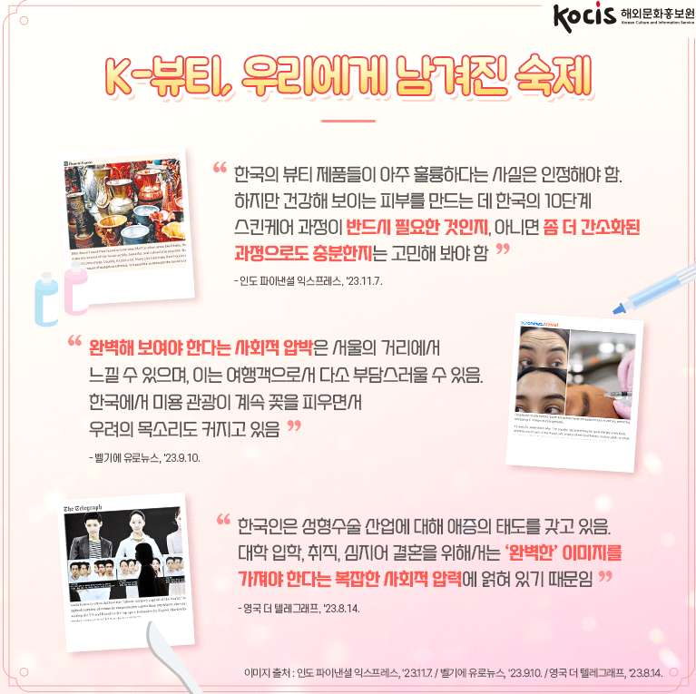 2. "완벽해 보여야 한다는 사회적 압박은 서울의 거리에서 느낄 수 있으며, 이는 여행객으로서 다소 부담스러울 수 있음. 한국에서 미용 관광이 계속 꽃을 피우면서 우려의 목소리도 커지고 있음"(벨기에 유로뉴스, '23.9.10.)