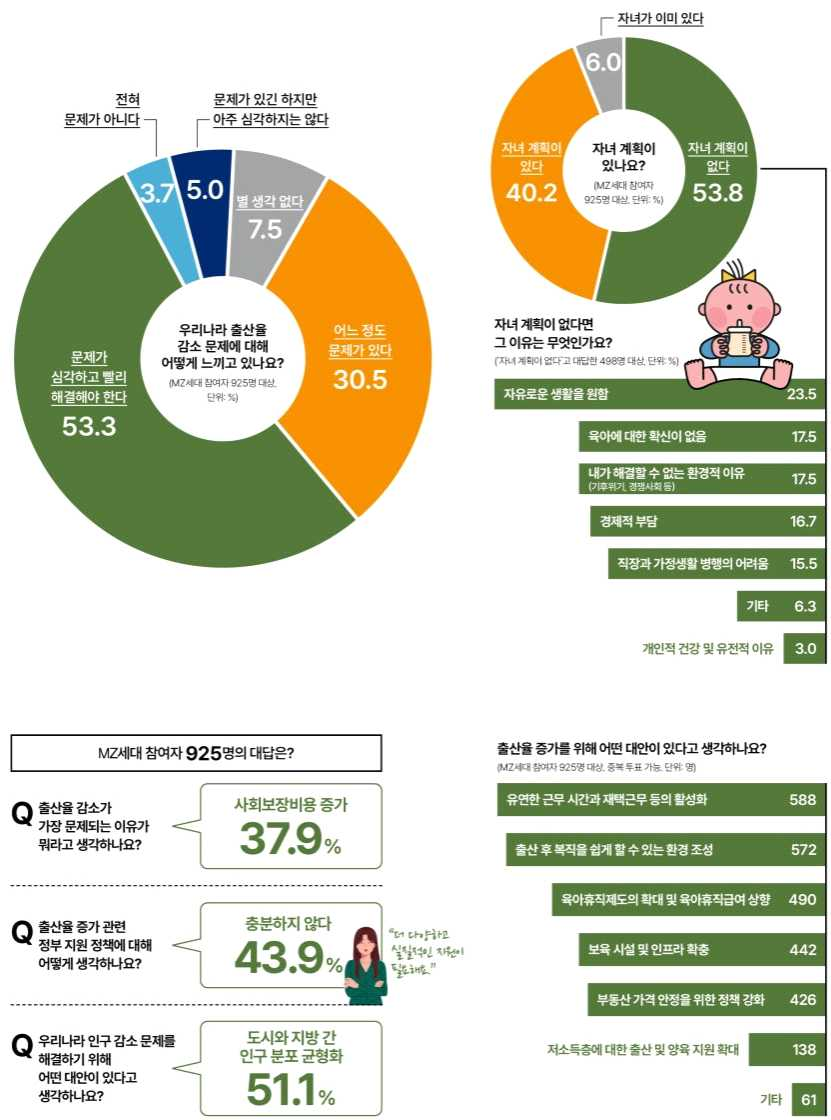 온라인 설문 조사 결과, 결혼과 자녀 계획에 대한 고민을 시작하는 나이대인 MZ세대 응답자의 53.3%가 출산율 감소 문제에 대해 '심각하고 빨리 해결해야 한다'고 했지만, 자녀 계획에 대해서는 53.8%가 '없다'고 응답했습니다.