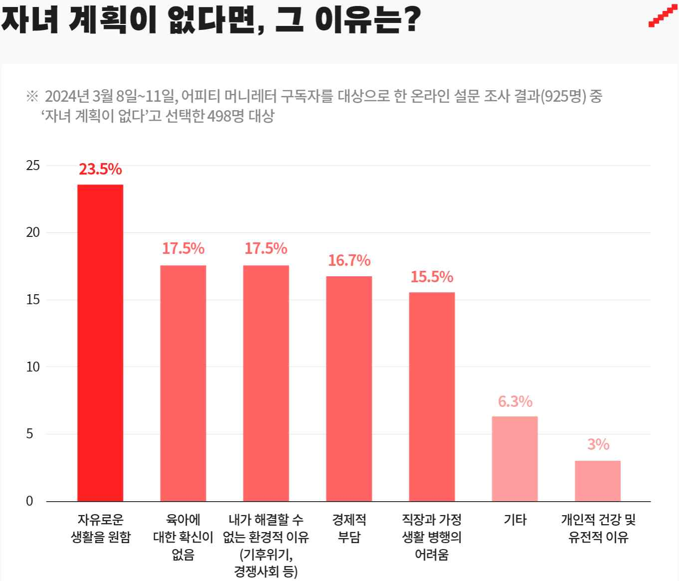 경제 콘텐츠 뉴스 레터 어피티가 머니 레터 구독자 925명에게 MZ세대(1980년대생~2000년대생)에게 자녀 계획과 저출산 문제에 대해 물어보았습니다.