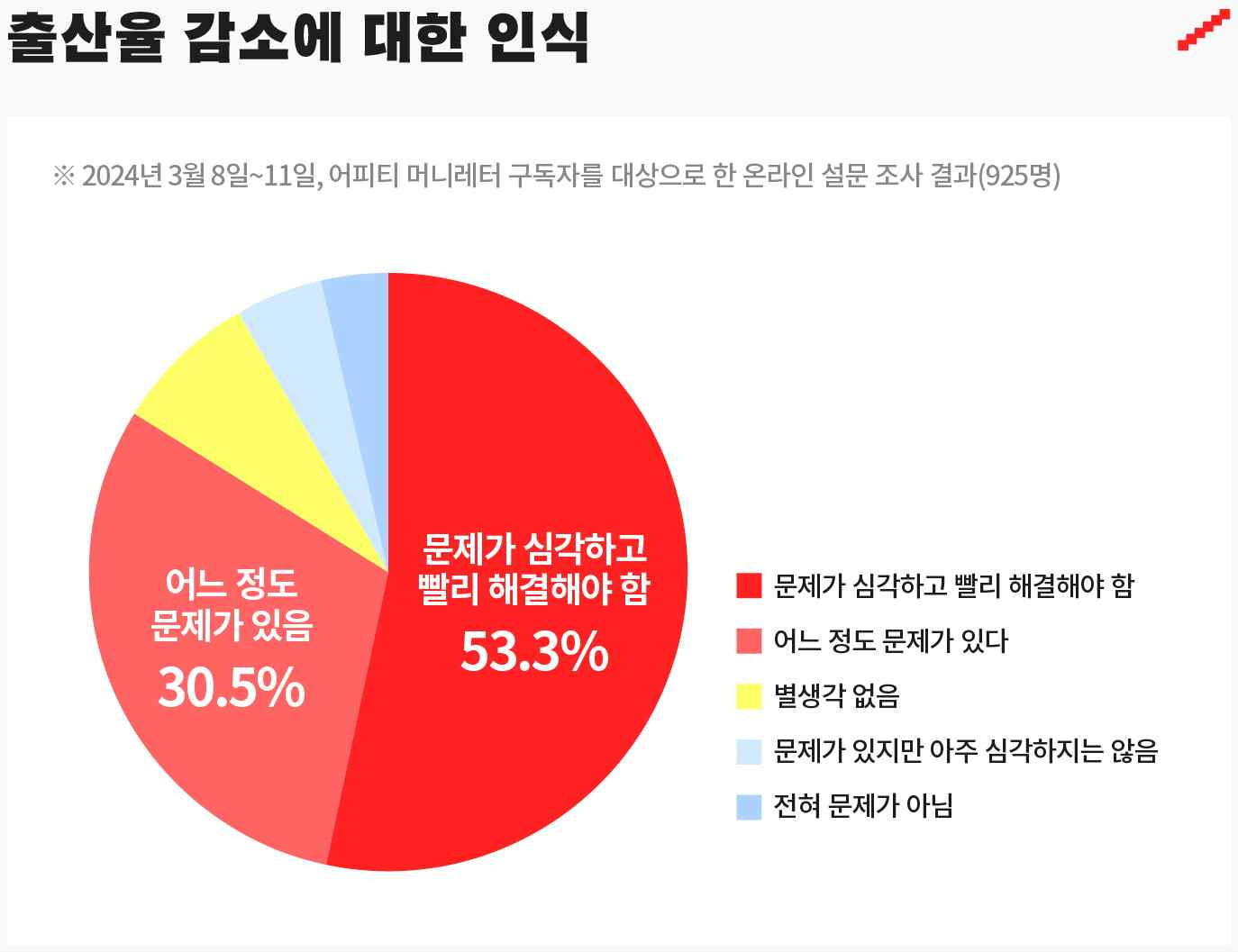 우리나라 출산율 감소 문제에 대해 어떻게 느끼고 있는지에 대한 질문에, 설문 참여자 53.3%가 '문제가 심각하고 빨리 해결해야 한다'고 대답했습니다.