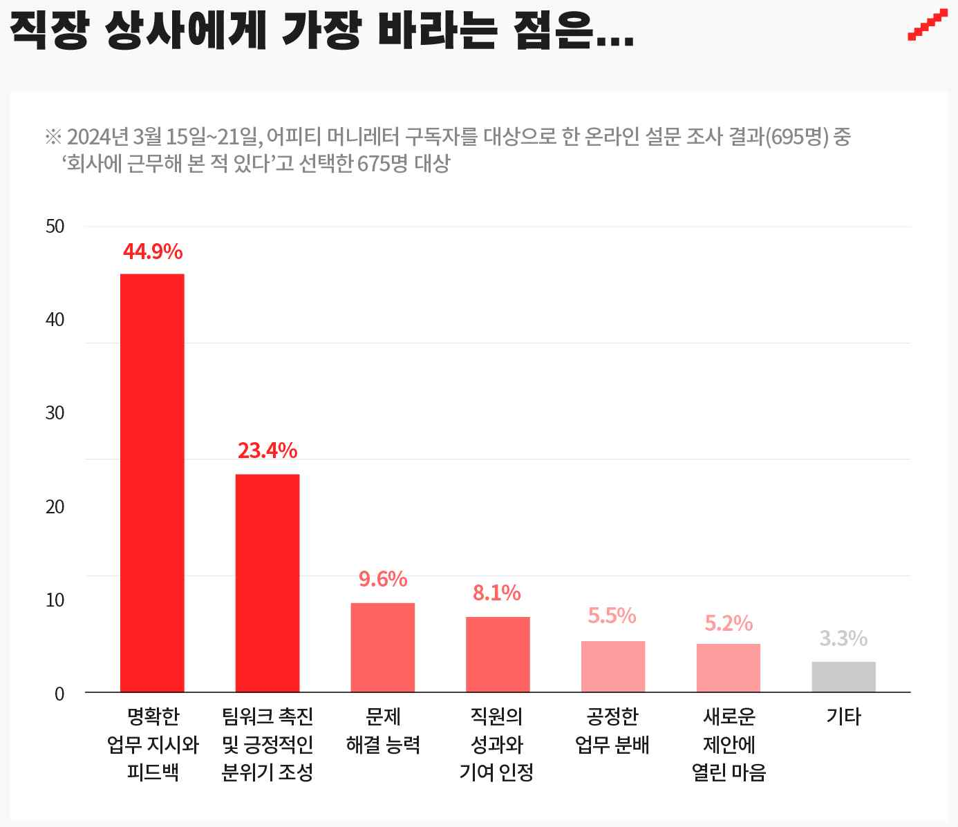 하지만 이러한 미디어 패러디가 과연 MZ세대 직장인들의 진짜 모습일까요? 현실 속에서 MZ세대는 어떤 생각을 하고 있고, 직장 상사에 대한 그들의 속마음은 어떨까요? 많은 분이 궁금해하실 이 질문에 답하기 위해, 어피티에서 MZ세대 직장인들에게 설문 조사한 진솔한 이야기를 알아보겠습니다.