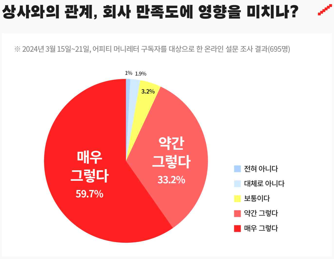 ① 상사와의 관계가 회사 만족도에 영향을 미치는지 묻는 질문에 '매우 그렇다'라고 답한 비율이 59.7%로 가장 높았음