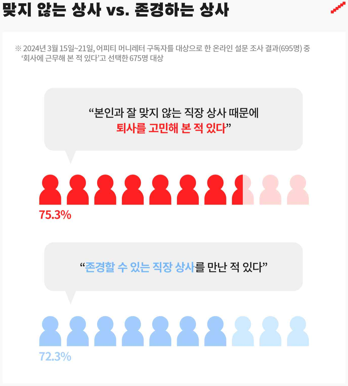 재미있는 점은, 존경할 수 있는 상사를 만난 비율과 퇴사를 고민하게 만든 직장 상사를 만났다는 응답의 수치가 비슷하다는 것인데, 이는, MZ세대가 상사와의 관계를 양날의 검으로 여기고 있다는 의미로 해석할 수 있습니다.