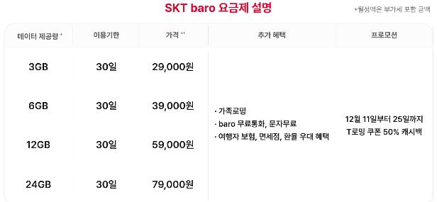 ◆ 바로(baro) 요금제(3GB, 6GB, 12GB, 24GB)