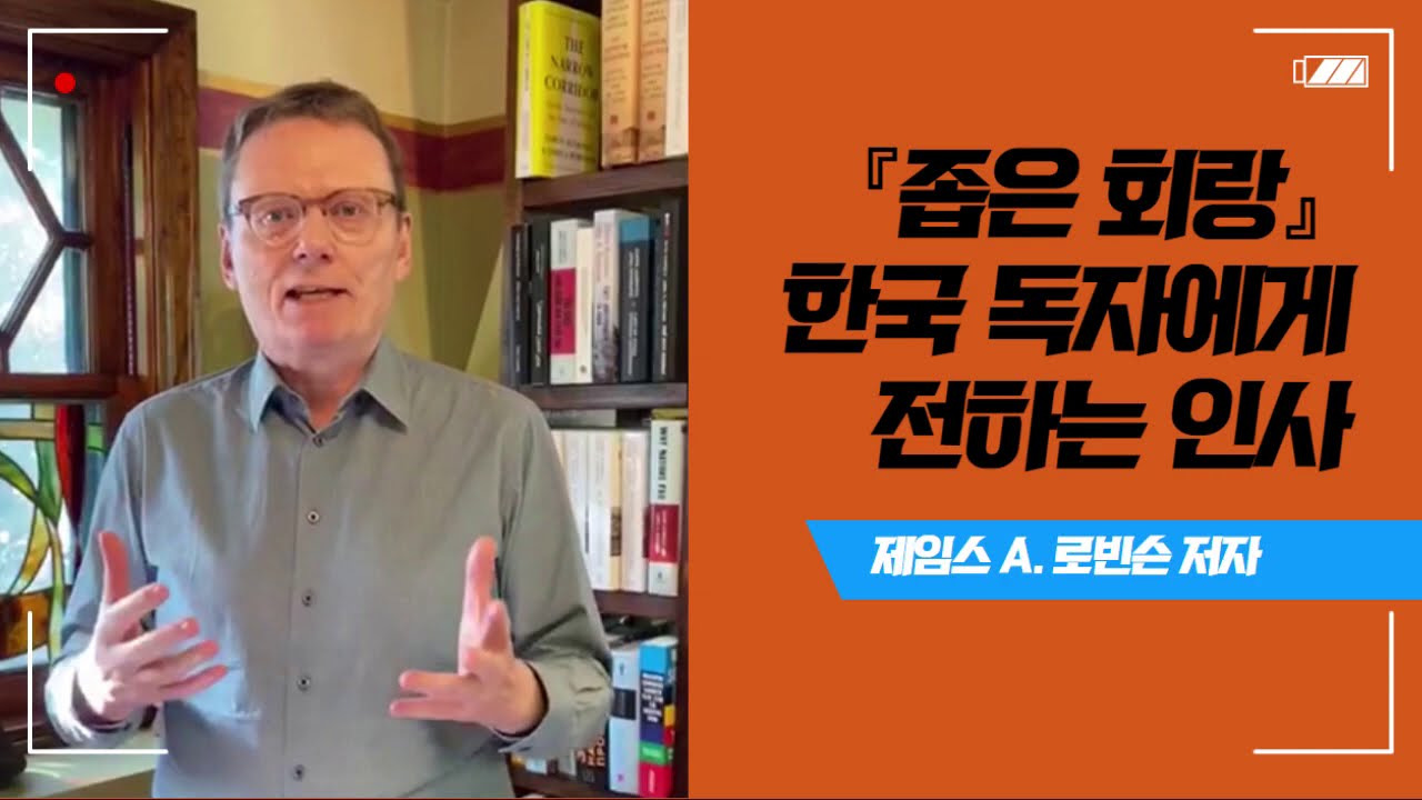 아세모글루 교수와 로빈슨 교수는 2019년엔 '좁은 회랑'을 같이 썼습니다. 이 책은 민주주의의 중요성을 강조하며, 국가가 '폭주' 하지 않도록 사회가 적절히 관리해야만 국가가 지속적으로 발전할 수 있다고 주장하고 있습니다. 두 사람은 민주주의와 경제발전이 함께 진행되는 좁은 길을 통해서 국가 발전이 가능하다고 강조했습니다.
