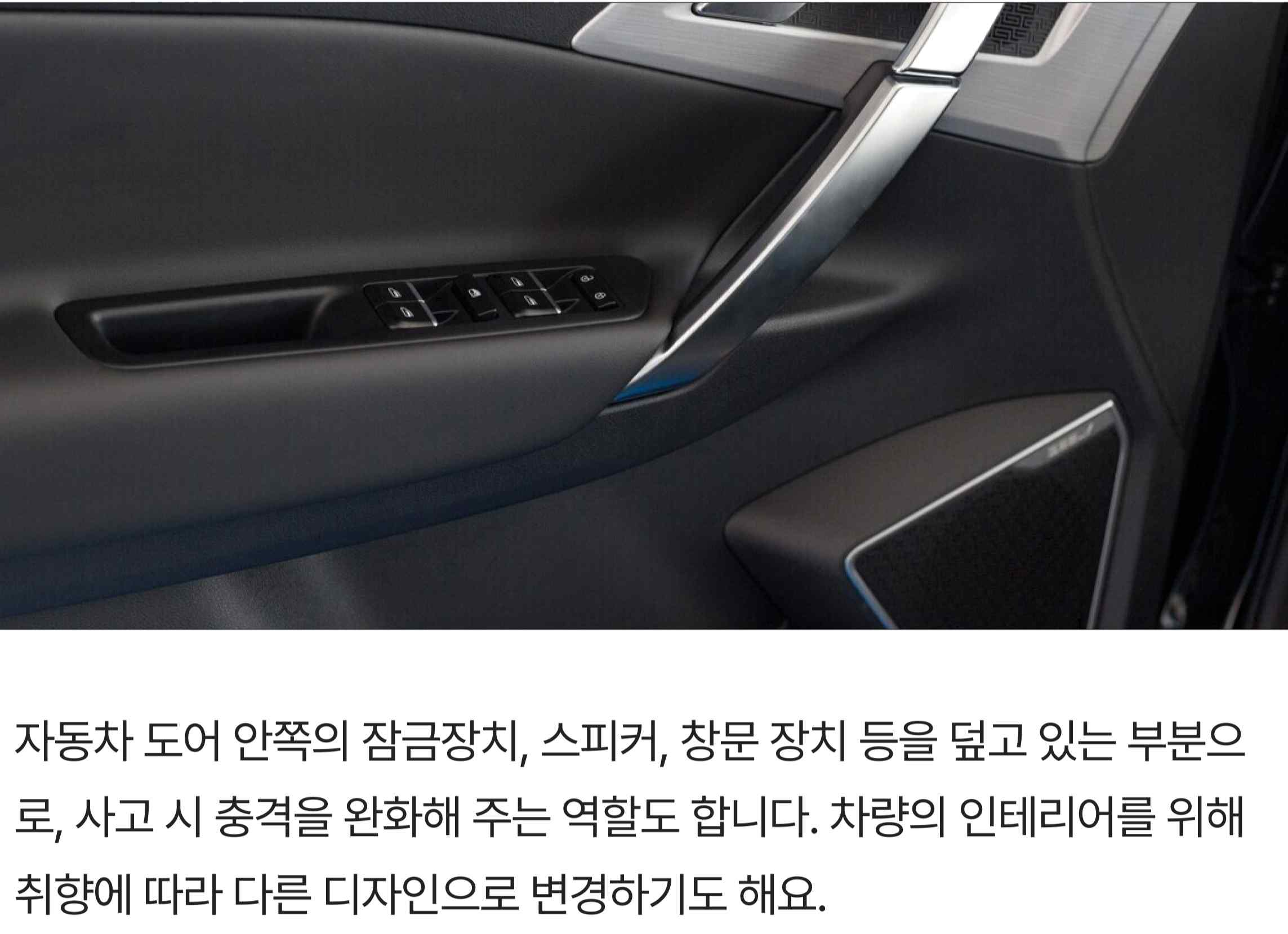 도어트림은 자동차 도어 안쪽의 잠금장치, 스피커, 창문 장치 등을 감싸는 부재입니다. 인테리어의 퀄리티를 한층 높여줄 뿐 아니라, 사고가 났을 때 충격과 마찰을 줄여 상해를 방지하는 역할을 합니다. 또한 도어와 윈도우 개폐 장치, 스피커, 수납공간 등의 편의성을 제공합니다.