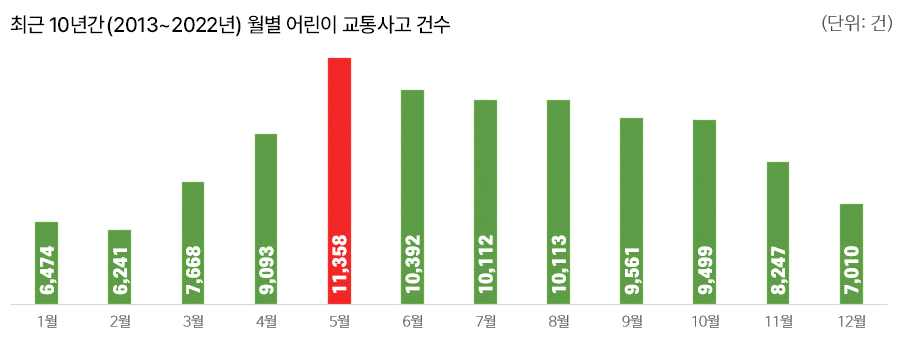 도로교통공단은 지난 10년간(2013~2022년)의 교통사고 빅데이터를 분석한 결과, 가정의 달 5월에 어린이 교통사고가 가장 많이 발생했다고 밝혔습니다.