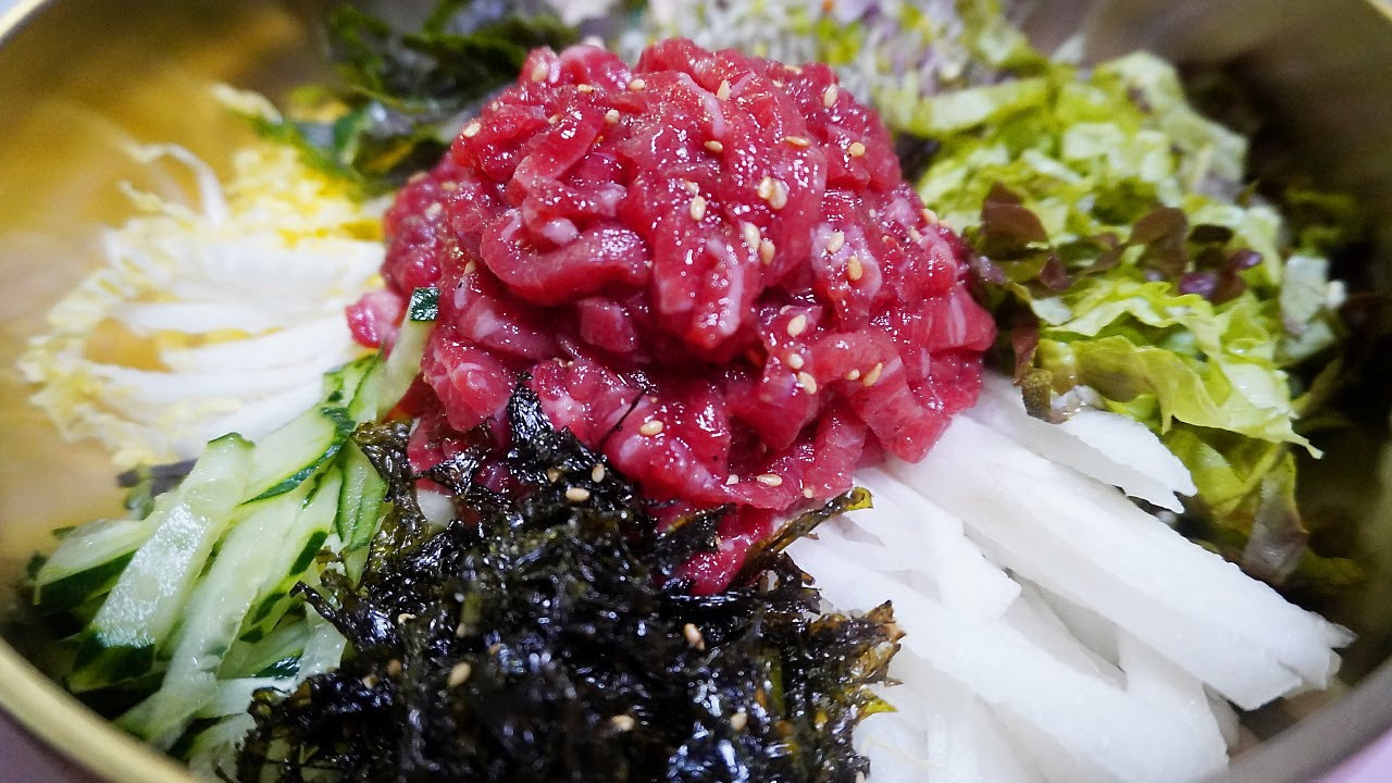 참고로 비빔밥에 들어가는 육회는 당일 도축한 소고기를 먹기 좋게 썰고, 고추장과 마늘, 참기름 등으로 양념해서 만듭니다.