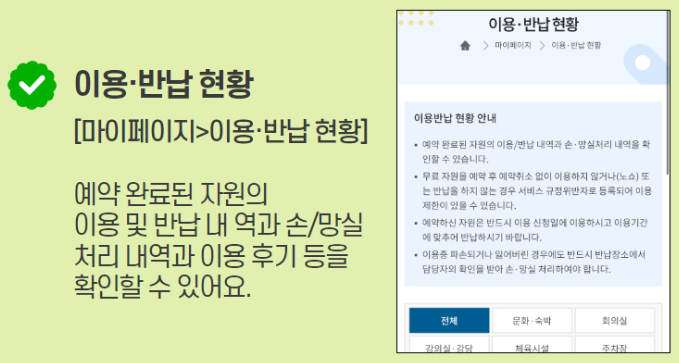 - 예약 완료된 자원의 이용 및 반납 내역과 손/망실 처리 내역과 이용 후기 등을 확인