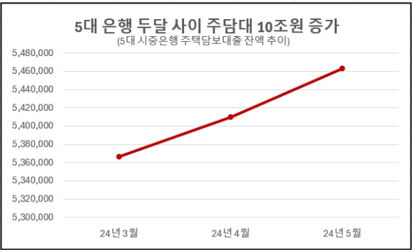 현재 주택담보대출, 증가세인데, 지난 5월 말 기준, 5대 시중은행의 주택담보대출(주담대) 잔액은 546조 원에 달했습니다. 총 546조 원을 빌려줬다는 뜻으로, 3월에 비해 9조 6천억 원 늘어난 금액입니다.
