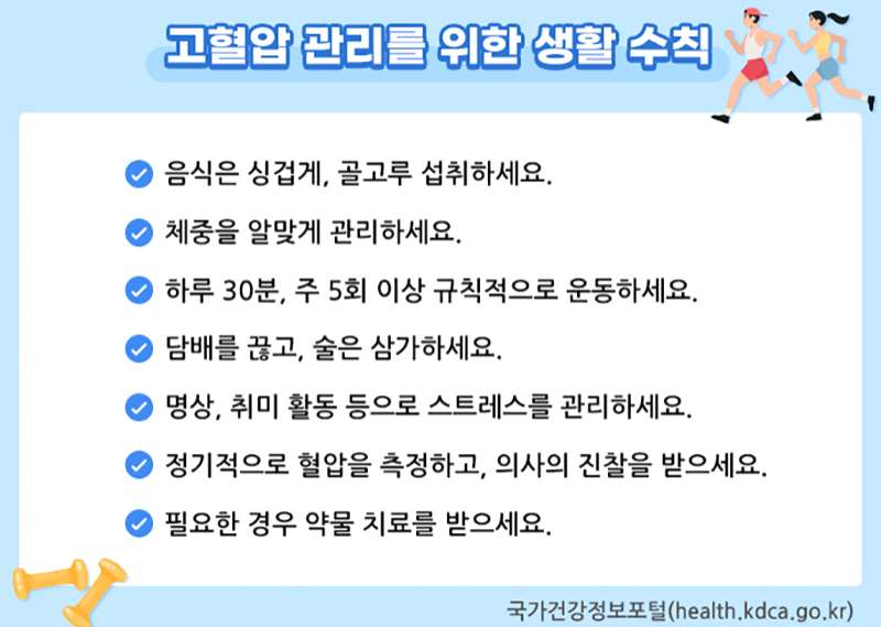 - 규칙적으로 혈압을 측정하고, 정기적인 검진을 받아 혈압 상태를 지속해서 모니터링하며 필요한 조치를 취하는 것이 중요