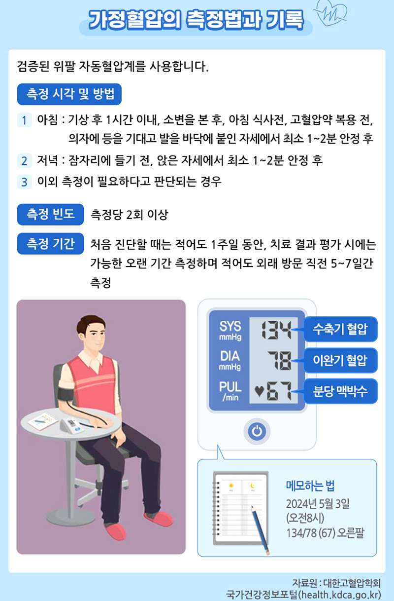 집에서 혈압을 잴 때는 검증된 위팔 자동혈압계를 사용하여 안정한 상태에서 올바른 방법으로 측정하는 것이 중요합니다.