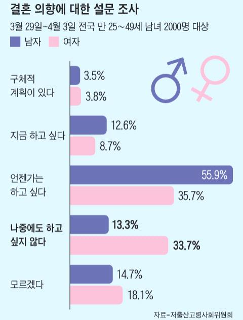 저출산위에 따르면, 응답 여성 33.7%는 "나중에라도 결혼하고 싶지 않다"라고 답했습니다. 같은 답을 한 남성 비율(13.3%)보다 3배 가까이 높았습니다.