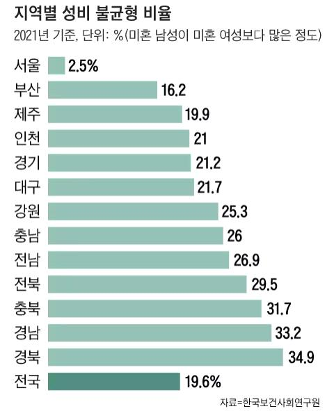 한국 결혼 성비 불균형 심각, 지역별 미혼 남성 비율
