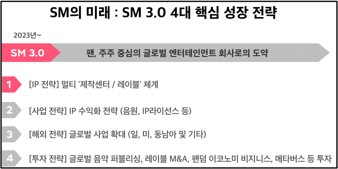 ② SM 3.0 전략 : SM은 'SM 3.0' 전략을 통해, IP(지적재산권) 수익화와 멀티 제작 센터 도입을 추진하고 있습니다. 이를 통해 2025년까지 매출 1.2조 원, 영업이익률 35%를 목표로 하고 있습니다.