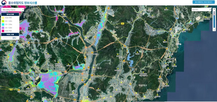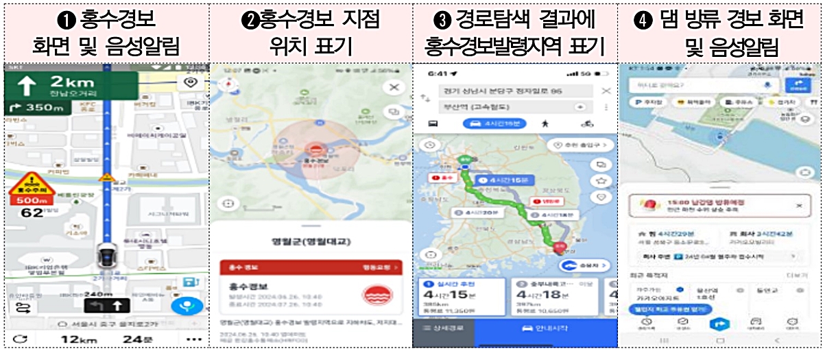 차량이 홍수경보 발령 지점 1.5㎞, 댐 방류 지점 1㎞ 이내에 진입하면, 내비게이션 화면과 음성으로 '500m 앞 홍수 주의' , '하천 수위 상승주의' 같은 경고를 내보낸다고 합니다.