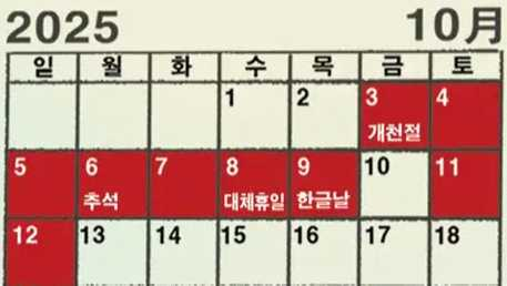한편, 10월 10일 금요일이 임시공휴일이 될지에도 관심이 모이는데, 10일이 임시공휴일로 지정되면 주말(11~12일)까지 열흘 연속으로 쉴 수 있기 때문입니다.