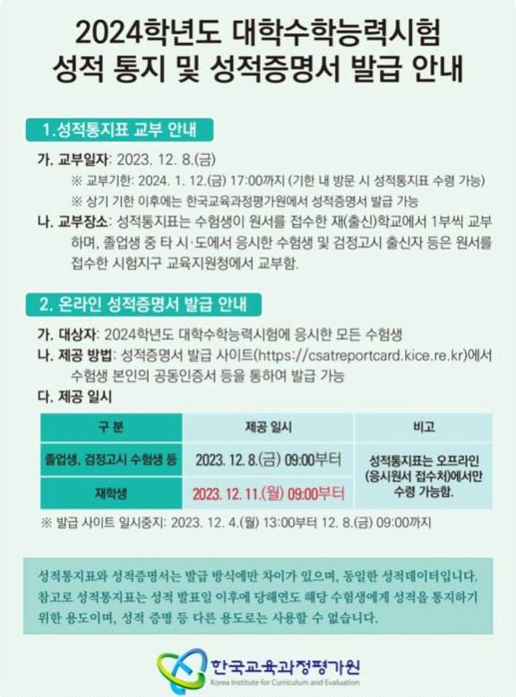 개인별 성적통지표는 접수한 곳(재학 중인 학교, 시험 지구 교육청, 출신 학교 등)을 통하여 수험생에게 교부하며, '성적통지표 교부 및 온라인 성적증명서 발급'에 대한 안내문을 수능 홈페이지에 게시하였습니다.