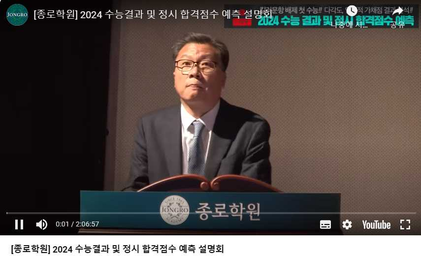 [종로학원] 2024 수능결과 및 정시 합격점수 예측 설명회 https://youtu.be/w98nE103xIE