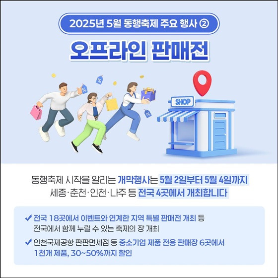더불어, 인천국제공항 내 중소기업 제품 전용 판매장인 판판 면세점과 행복한 백화점 등 중소기업 제품 전용 판매장 6곳에서 1,000개 제품을 30~50%까지 할인해 판매합니다. 또한 전통시장과 골목형 상점가에서도 동행 축제가 열립니다.