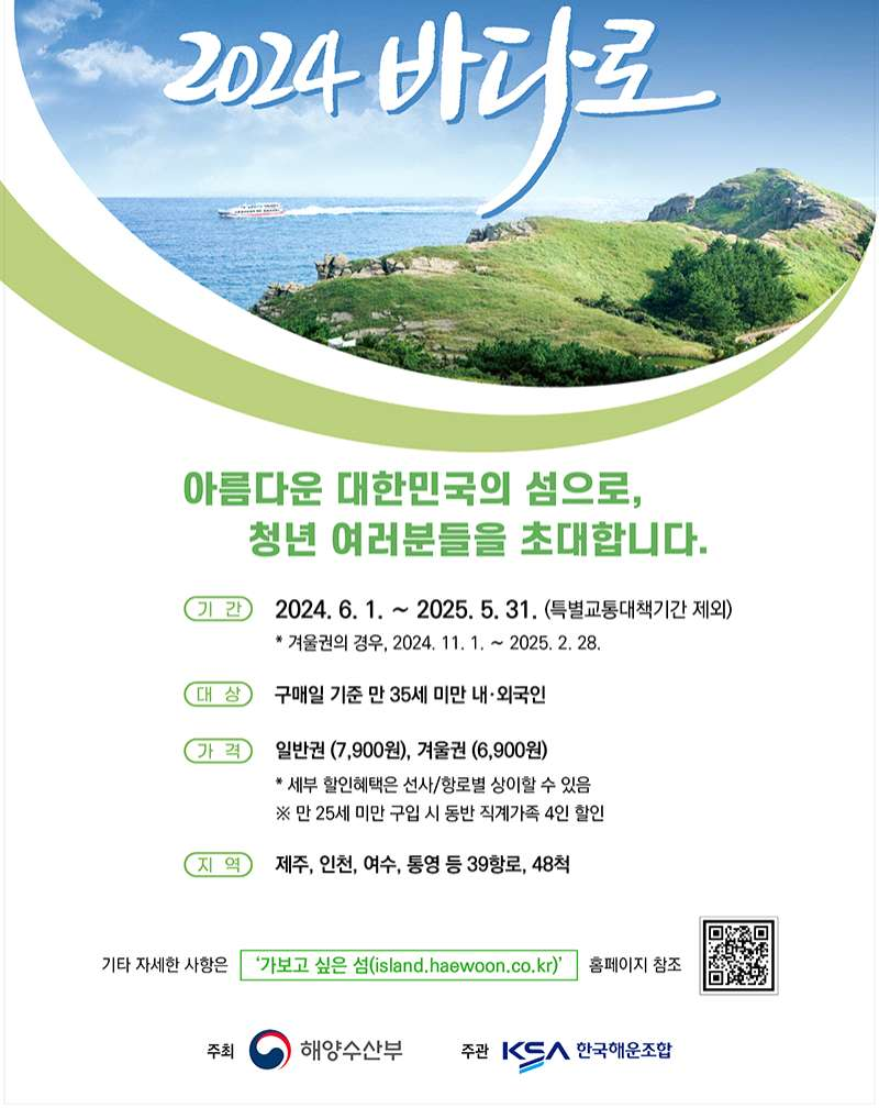 최대 50% 할인된 가격으로 여객선을 이용할 수 있는 '바다로' 판매가 개시됩니다. 해양수산부는 6월 1일부터 연안여객선 할인이용권'2024년 바다로' 판매를 시작한다고 5월 31일 밝혔습니다.