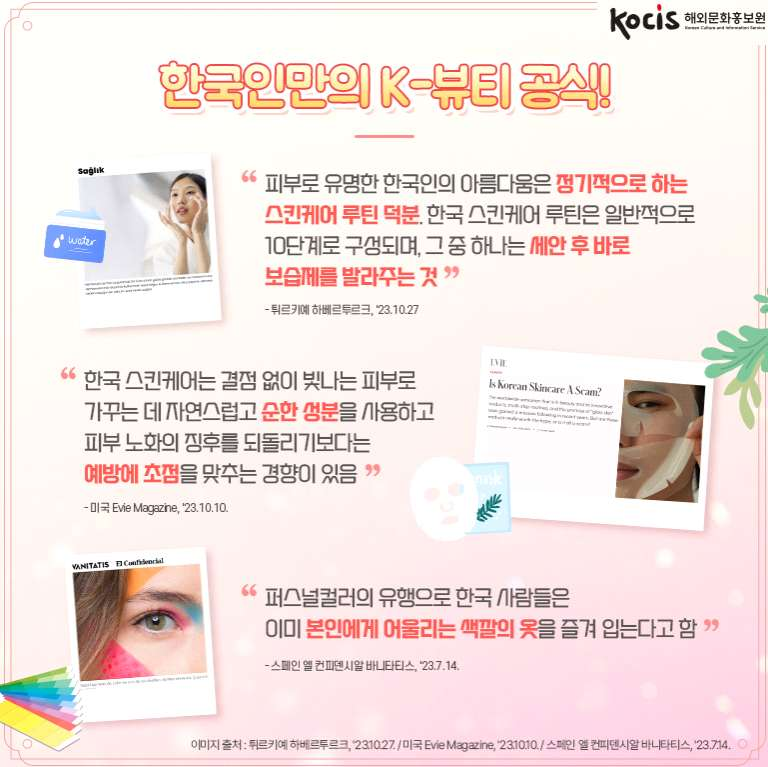 1. "피부로 유명한 한국인의 아름다움은 정기적으로 하는 스킨케어 루틴 덕분. 한국 스킨케어 루틴은 일반적으로 10단계로 구성되며, 그중 하나는 세안 후 바로 보습제를 발라주는 것"(튀르키예 하베르투르크, '23.10.27.)