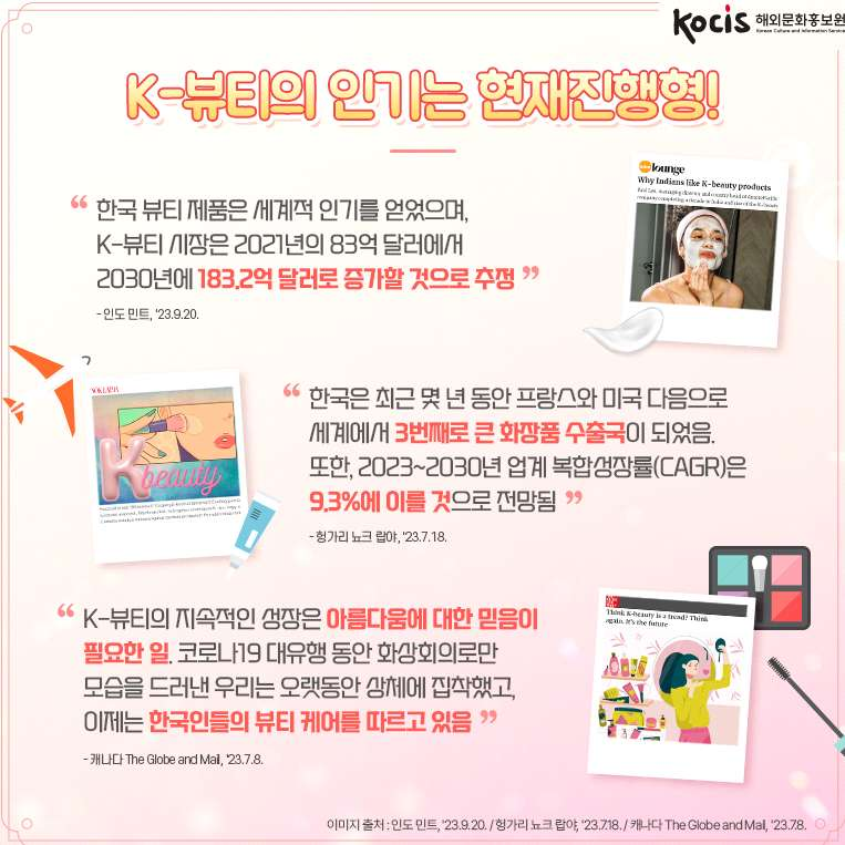 1. K-뷰티의 인기는 현재진행형, "한국 뷰티 제품은 세계적 인기를 얻었으며, K-뷰티 시장은 2021년의 83억 달러에서 2030년에 183.2억 달러로 증가할 것으로 추정"(인도 민트, '23.9.20.)